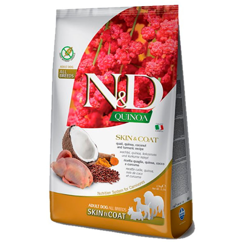 Сухий корм-дієта Farmina N&D Grain Free Quinoa Skin & Coat Adult Mini Quail призначений для дорослих собак середніх і великих порід, які страждають на харчову алергію.